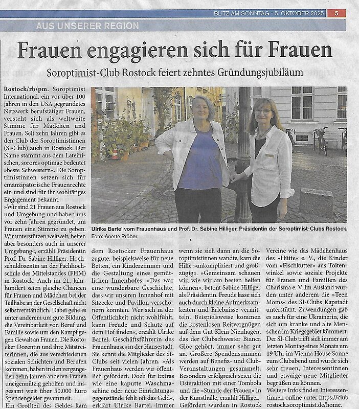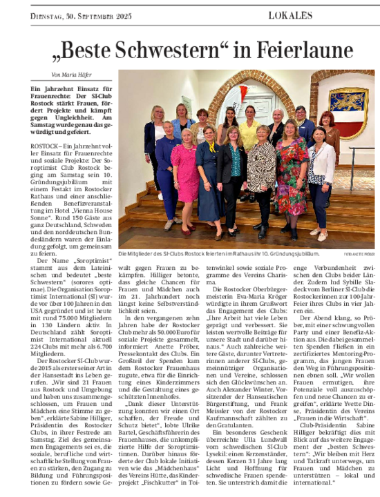 Bericht in der NNN (30.09.2025, Seite 15) anlässlich des 10-jährigen Jubiläums des SI Club Rostock