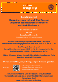 Ab dem 25. November, dem Internationalen Tag gegen Gewalt an Frauen, bis zum 10. Dezember 2025, wird der Soroptimist Club Rostock zum dritten Mal auf dem Universitätsplatz in Rostock einen 5 Meter hohen Orangefarbenden Stern aufstellen und damit erneut ein sichtbares Zeichen gegen Gewalt an Frauen setzen.